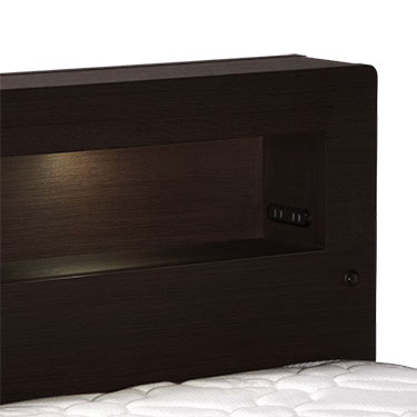 This box type headboard is what you have been looking for. It comes with a shelf space with built-in LED lights and outlets for charging smart phones, etc.