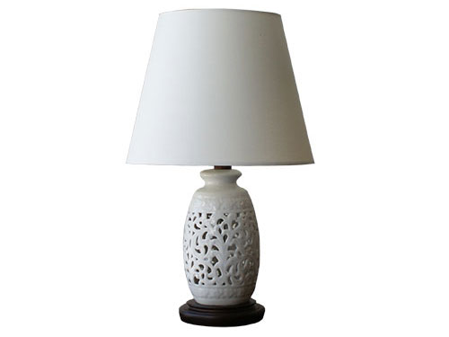 The combination of the openwork base and simple shade gives this table lamp a neat and elegant impression. The gentle light falling on the milky white porcelain creates a sense of tranquility and calm.