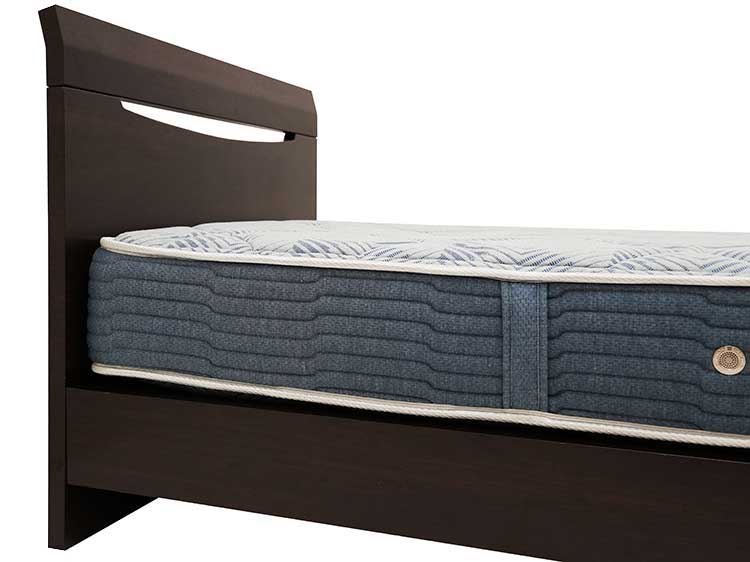 This is the Seluna bed. It comes with a straight headboard to minimize size and make sure it fits even in compact bedrooms. The headboard is slightly rounded on the edges to give a soft feel, and for design there is a horizontal slit in the headboard. It is perfect as a children's bed or even for guests, and it is very cost-efficient due to the basic design.