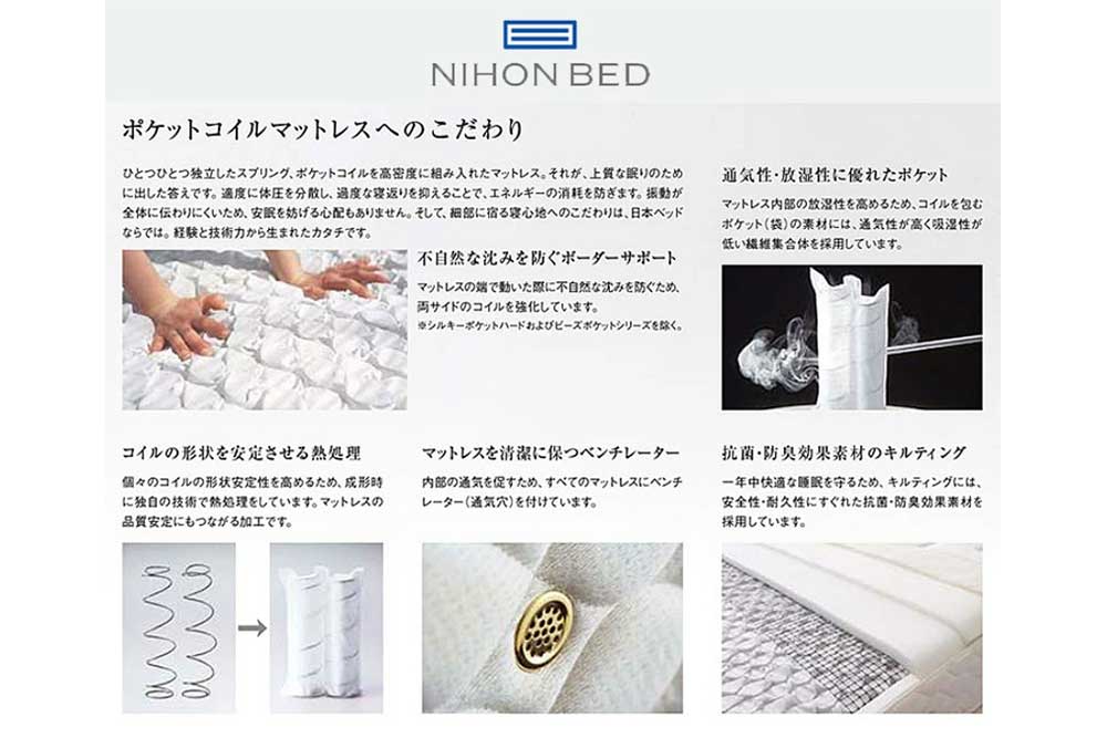 A mattress that incorporates high density pocket coils, each of which is an independent spring. This is the answer to a quality sleep. By distributing body pressure appropriately and suppressing excessive tossing and turning, it prevents energy loss. Vibrations are not easily transmitted throughout the mattress, so there is no need to worry about disturbing your sleep. And the attention to detail in the comfort of the mattress is unique to Nippon Bed. It is a shape born from experience and technical skill.