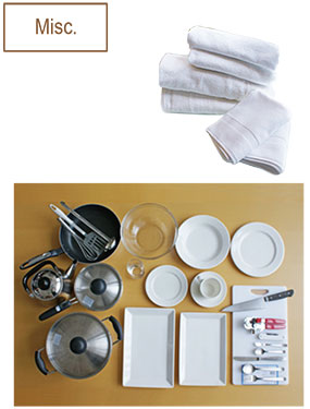 Kitchen Utensils for 4 people, Bath Towel x 8, Hand Towel x 8, Bath Mat x 4