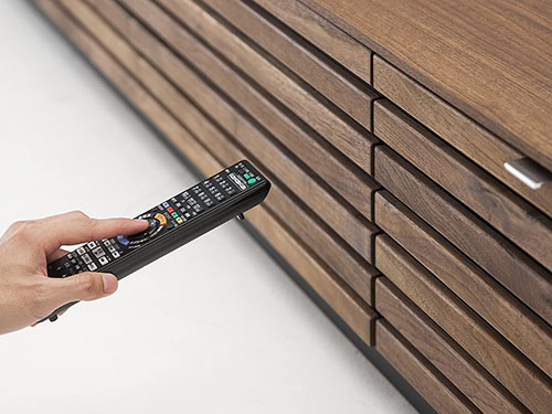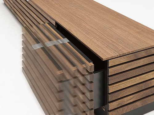 This is made with walnut wood in oil finish. The louver design is applied on even the sides, to make it look great with the natural wood, not only on the front but on all sides. This shows the commitment to luxury.