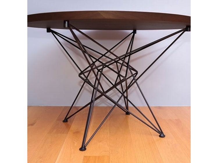 The matte black powder-coated steel legs take a mechanical approach with the visual effect of looking different at different viewing angles.