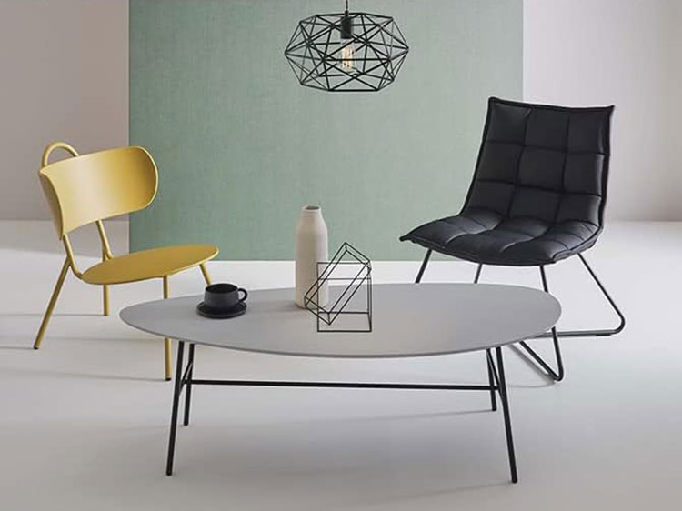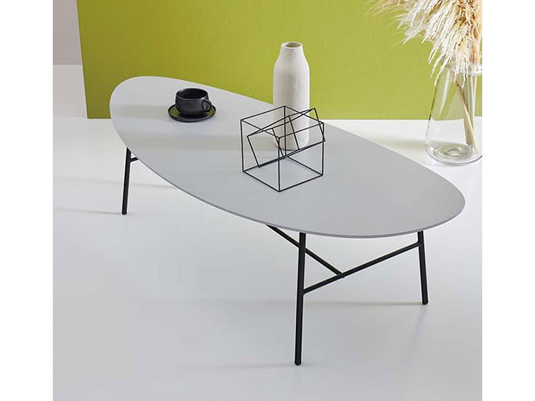 A stylish living table with an asymmetrical oval top.