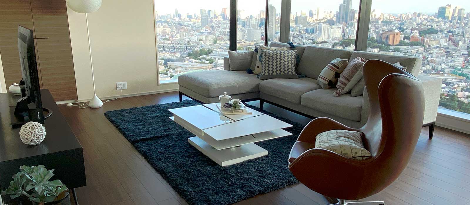 L-shape Sofa Set, Coffee Table, End Table, Rug, 50 inch TV, TV Board, Floor Lamp, Table Lamp
